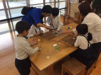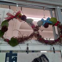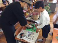 鍋谷町のお花屋さんを講師にお招きして、1年生がリースづくりを行いました。夏に育てた朝顔のつるを利用したり、拾ってきた松ぼっくり等を使って飾りつけをしました。講師の中村さんが用意してくださったお花やいい香りのする葉っぱも使うと色鮮やかなリースに仕上がりました。自分でデザインしたリースに満足そうな笑顔の子どもたちでした。