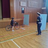3年生は「自分の目で確認」「ヘルメットの正しいかぶり方」「一時停止」「左側通行」の4つを教わった後、体育館で実際に自転車に乗り、警察署の方が作ってくださったコースを一人ずつ回りました。
