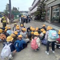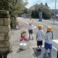 1年生は「正しい道路の歩き方」を教わり、実際に外に出て道路や横断歩道を歩く練習をしました。警察署の方から教わった「飛び出さないこと」「自分で左右をよく確認すること」を意識して上手に歩くことができました。