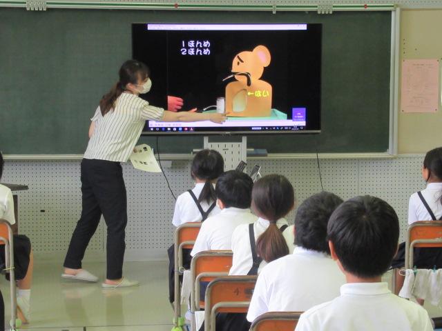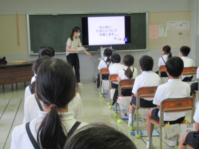 能登中部保健福祉センターの先生をお招きし、5・6年生を対象に薬物乱用防止教室をおこないました。たばこにはガンの原因となるタールという物質をはじめ、体に悪い物質が200種類も含まれていることなどを学びました。また、副流煙による受動喫煙の恐ろしさも教えていただきました。