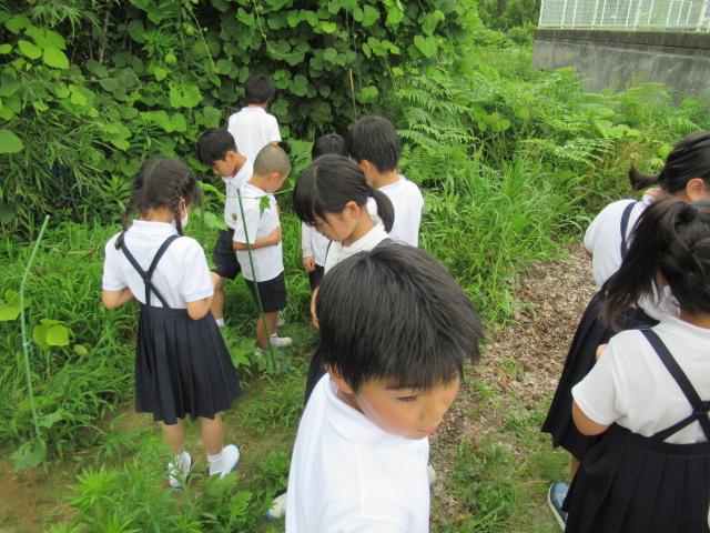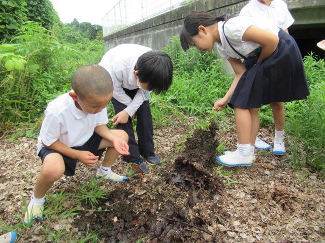2年生が生活科で「生き物探し」を行いました。運動場の草むらからバッタやカマキリ、コオロギなどを見つけ、大歓声があがりました。また、地面の中から現れた大きなミミズや幼虫にも驚きでした。