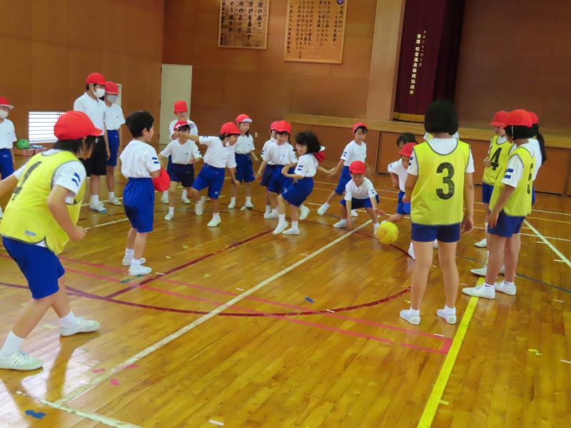 1年生と6年生が赤団と白団に分かれて、6年生企画による交流会を行いました。「花いちもんめ」や「だまさんが転んだ」、「転がしドッジホール」などを楽しみました。この交流会を通して6年生はリーダーとしての気持ちが一段と高まるとともに、昼休みに1年生を遊びに誘う姿も多く見られるようになりました。