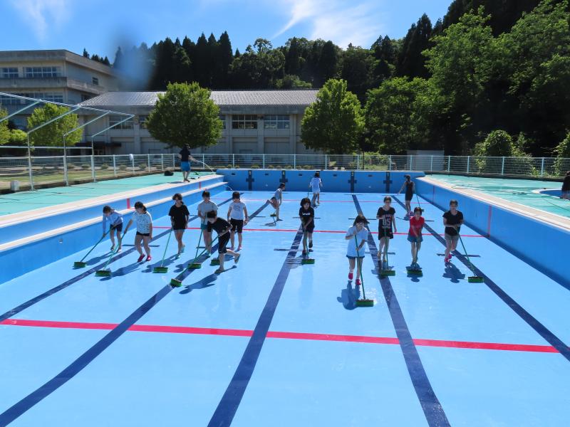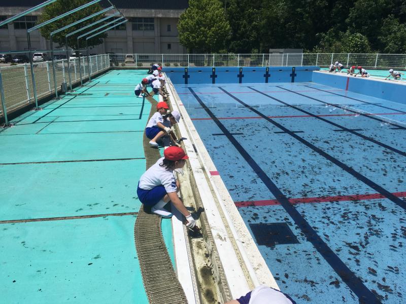 6月17日、とても暑い日となりましたが、3年生以上でプールそうじを行いました。3・4年生はプールサイドやトイレ、5・6年生は大プールと小プールの中をピカピカにしました。水のたまったプールに入るのが楽しみです。