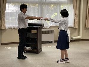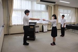 代表で3年生の二木さんが平野校長より賞状を授与しました。