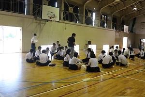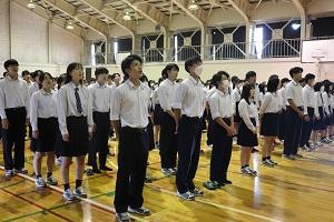 全校生徒で、国歌・校歌・輪高賛歌の練習を行いました。