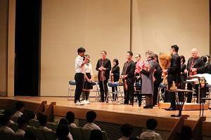 平野校長からの「ノるところはノる キくところはキく」のとおり、生徒は盛り上がるところは盛り上がり、みんなで楽しそうに手拍子などをしていたところが印象的でした。指揮者体験の部では輪島高校から新典さんが指揮者として参加しました。とても貴重な体験をすることができました。最後は生徒会長の北出さんより「素晴らしい演奏をありがとうございました。」と花束が手渡され、締めくくりとなりました。