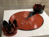 『睡蓮』 葉は漆を何度も重ね塗り、花は紙胎で花びらを表現し、金箔を散らしてあります。蕊はお箸です。