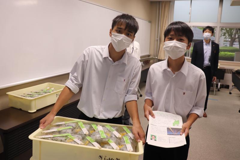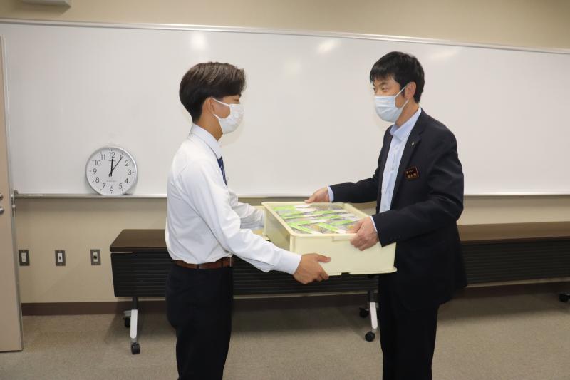 選手代表として上野和孝さんと上野雄生さんが、桐章会と平野校長から激励費を受け取りました。