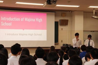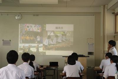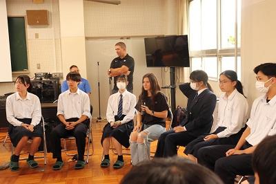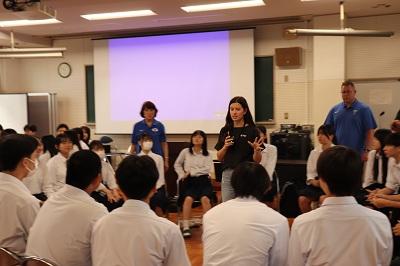 英語で学校紹介のプレゼンテーションをしました。そして、ブリガム・ヤング大学の3人の学生さんがBYUの事をお話してくださいました。