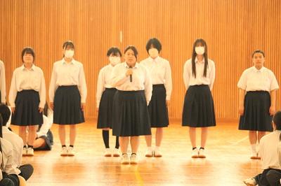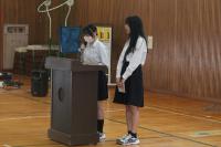 式では、校長先生からや、生徒会長から激励の言葉が送られ、出場する選手たちが力強く決意表明を行いました。全校生徒からの温かい拍手が会場を包み、温かく力強い式となりました。