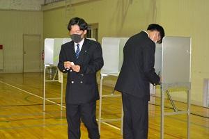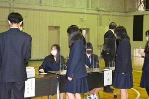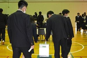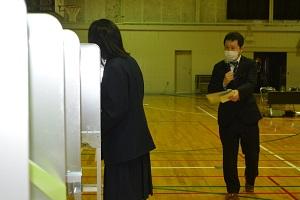 県と市の選挙管理委員会から4名をお招きし、選挙の意義、選挙制度について、資料に基づき説明を受けた後、生徒らは、配布された模擬選挙公報から、各立候補者の主張を比較し、模擬投票用紙に意中の立候補者名を書いた「1票」を投票箱に投じる模擬投票を行いました。模擬投票場では、生徒代表らが実際の投票場の受付係、投票立会人など様々な役割も体験しました。