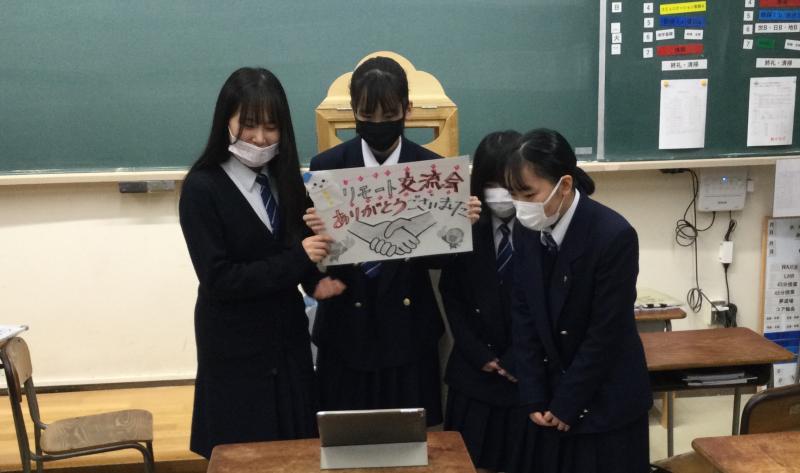 12月13日(月)の放課後、JRC部の4名は、介護老人保健施設百寿苑に入所されている方々とリモートでの交流会を行いました。例年は施設を慰問していましたが、新型コロナウィルス感染症予防対策のため、昨年度と同様に学校と施設のオンラインによる画面越しでの交流となりました。
