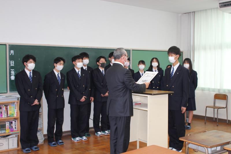 11月12日(金)に校長室で表彰伝達式が行われ、輪島税務署長の羽土さんより表彰状と記念品を頂きました。