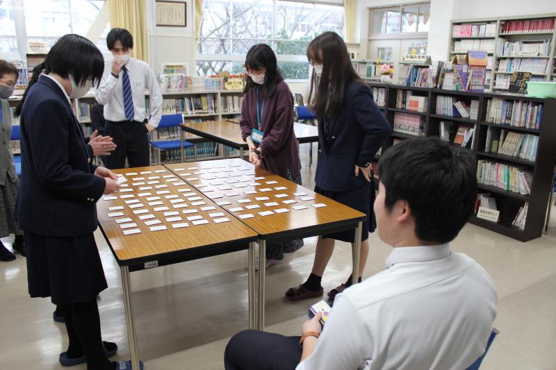 図書委員会、行事担当の生徒が司会進行を務め、生徒、職員から募った14名の参加者は、くじ引きで決まった相手とトーナメント方式で対戦しました。対戦が進んでいくと勢いよくカルタを取る音や様々な掛け声と共に熱戦が繰り広げられました。また、決勝戦では、周りから見守られ、大盛況で楽しい時間となりました。