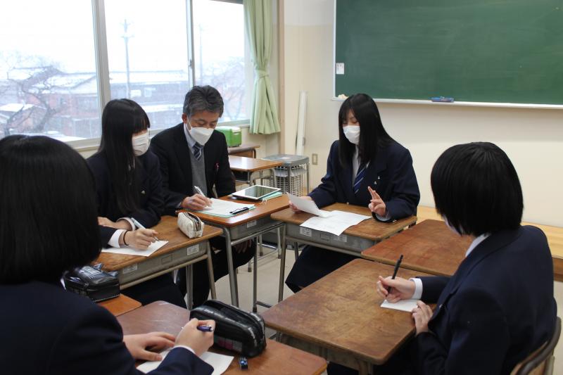 座談会は、3年生3名と2年生11名が参加し、3年生から公務員を目指した動機や試験までの勉強方法、実際に受けた面接の様子などについて説明を受け、その後意見交換がなされました。市役所の採用試験に合格した3年生は、「ダメだった時のことを考えず勉強に集中した。自分に逃げ道を作らなかった。」「深夜まで家で勉強するよりも授業を一番大事にしていた。」と話していました。他の3年生も「日頃から新聞や気になるニュースに目を通していた。」「苦手な分野を早めに見つけて克服するように努力した。」「作文対策として構成を考えてから書く練習をして先生に何度も添削してもらった。」など、自分の取り組みを振り返ってアドバイスしていました。