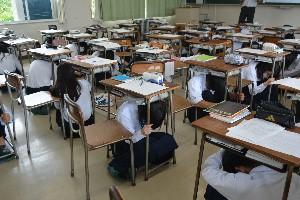 この訓練は「しゃがむ」「隠れる」「じっとする」といった安全行動を約1分間行うもので、この日は、11時に地震を想定した放送が流れると、生徒は机の下にもぐり、頭や体を守るための行動を実施しました。