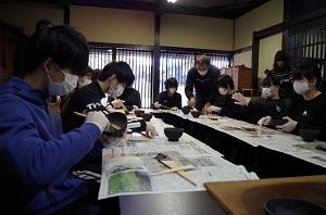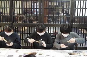 11月14日、輪島塗チーム10のメンバーが、工房長屋にて輪島塗の作業工程のひとつである「下地」のうち「三辺地塗り」を体験しました。