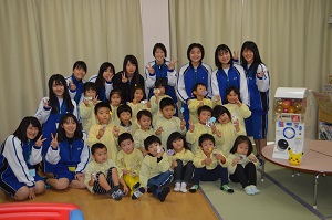 園児のみなさんに課題研究の一環で開発した手洗い石けん「泡輪」(あわわ)を使ってもらい、風邪の予防のために手洗いが大事だということを伝えました。