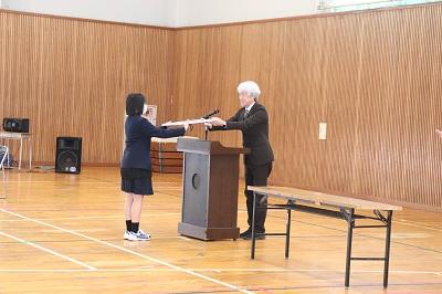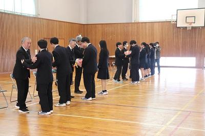 24日(月)、表彰伝達式、3学期終業式、離任式が行われました。