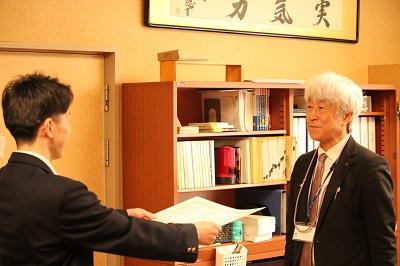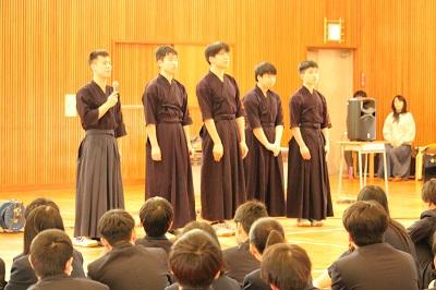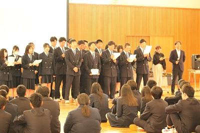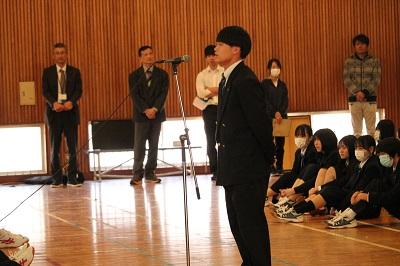 対面式を行いました。在校代表の吉浦 謙心さんが歓迎のメッセージを送った後、