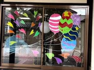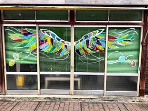 わいち商店街のショーウインドウに美術部とJRC部が絵を描いてきました。