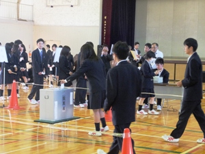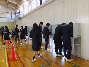 来年夏から選挙権年齢が18歳以上に引き下げになることから、3年生を対象に模擬投票などを体験する出前講座を行っていただきました。