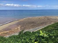 沖の方までずっと海が赤茶色に染まっています