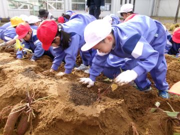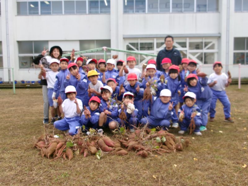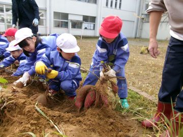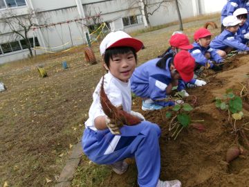 5月に植えたサツマイモをほりました。JAの方にほり方を教えてもらった後、土をどんどんほっていくと、立派なサツマイモが!!大きなサツマイモを手に、どの子もとてもうれしそうでした。