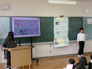 打喜漆器店グループ、山中児童センターグループ、長楽グループ、山中石川屋グループ、LUCCI CAFE グループにわかれ、スライドや新聞にまとめたり、劇で表現したり、クイズをしたりとそれぞれのグループで楽しく分かりやすい工夫をして、見つけたすてきなヒミツを発表しました。