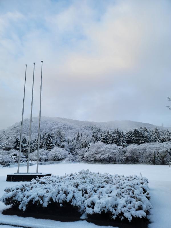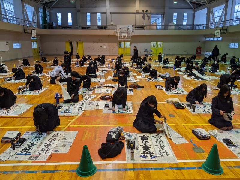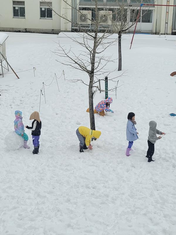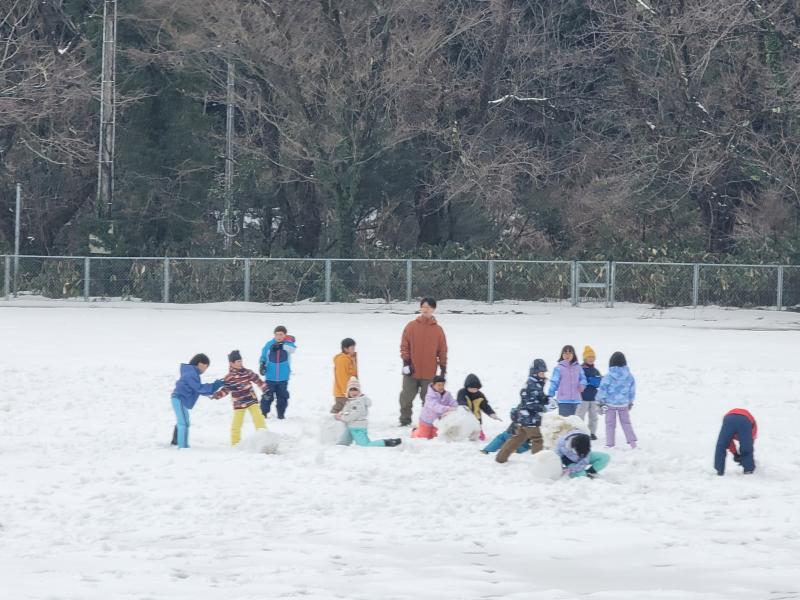 3学期の始業式の後に行われた校内書初め大会の様子や、雪が降った後の中庭で元気に遊ぶ様子です。寒い中、子どもたちは元気です。