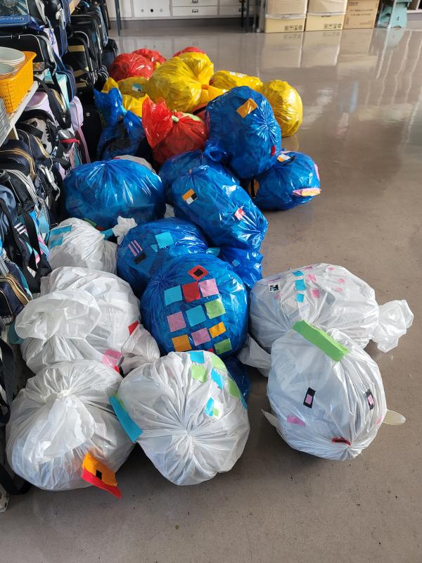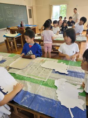 運動会の団体演技で、3,4年生の手作りの魚が使われます。その他、全体練習や図工の授業の様子です。