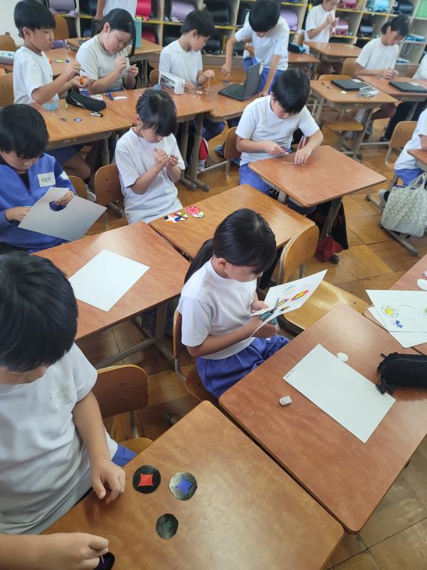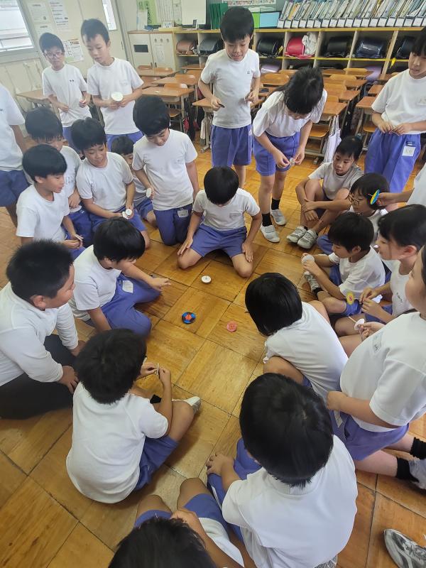 3年算数の「円」の学習で、コンパスの使い方を学んだことを生かし、コマ回し大会がありました。