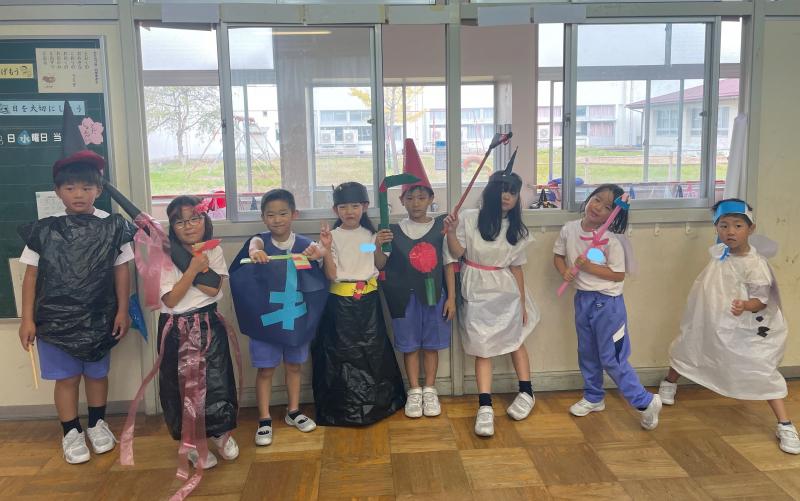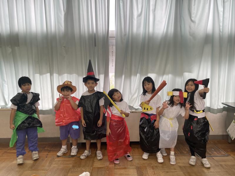すばらしい秋晴れのもと、バス遠足に行ってきました。河南小学校との交流会前、自分たちの手作りで仮装したの写真もご覧ください。