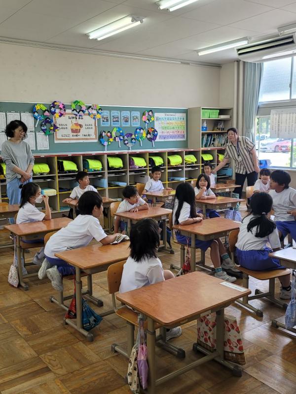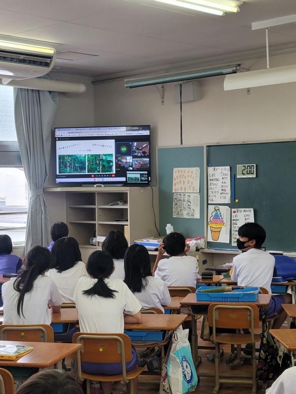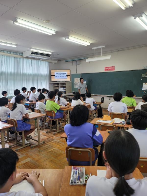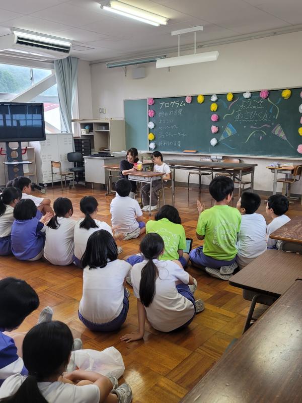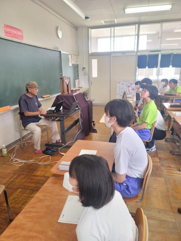 8月6日登校日。6年生は直接、その他の学年はオンラインで、庄小学校で読み聞かせをしておいでる佐藤さんが平和学習の一環で、山中の地下壕等のお話やかみしばいをしてくださいました。