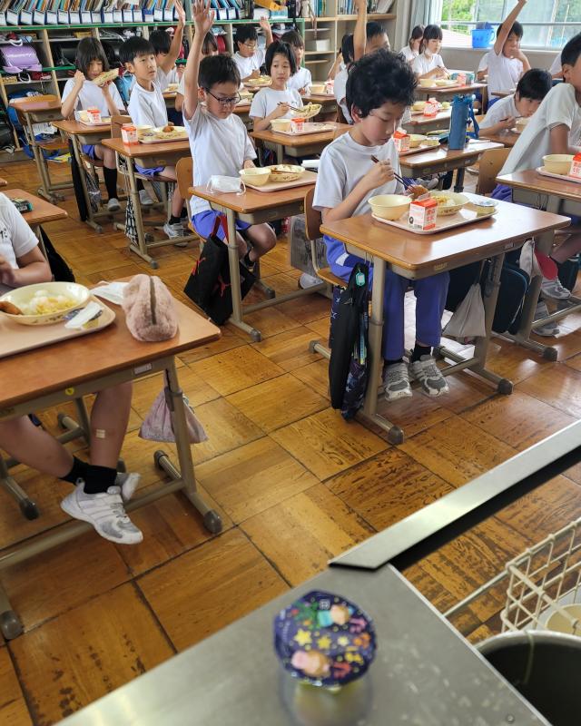 7月3日たなばた給食。冷たいゼリーがおいしかったです。2年生はdlを勉強し、いろいろな水の量を量りました。