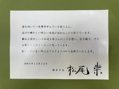 その他にも、鎌倉市長様、福島市長様などからメッセージをいただきました。これらのメッセージについては、12月25日まで玄関に掲示したいと思います。ありがとうございます。