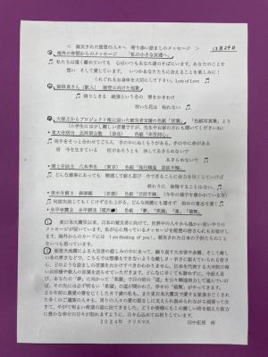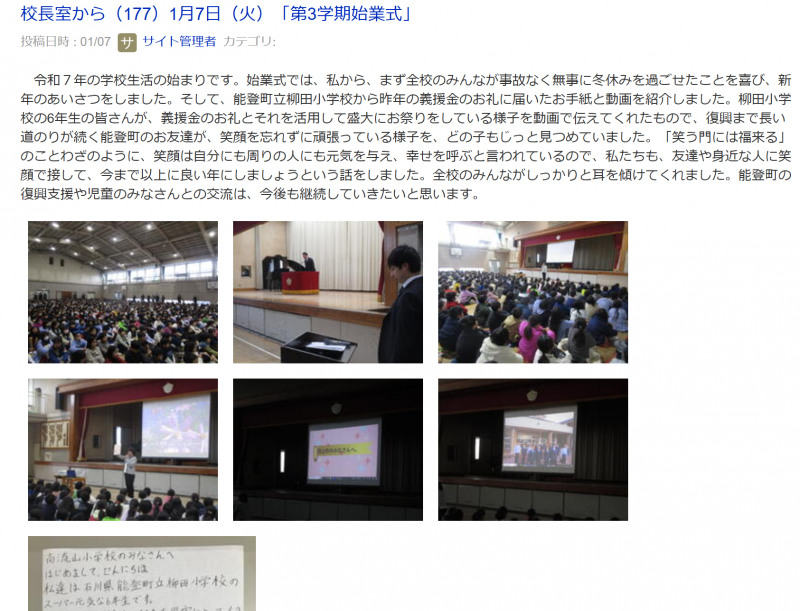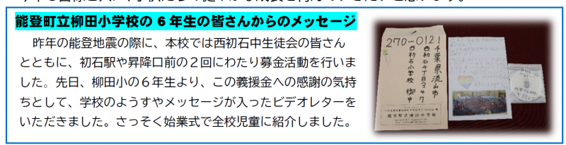 2025年1月10日 14時04分6年生は昨年末に流山市内の小学校へ、義援金のおかげで「柳田小笑顔まつりwith町野小」ができたことに感謝して、お礼の手紙と笑顔まつりの様子を映したDVDを送りました。そこで、流山の小学校では、始業式や学校だよりで紹介してくだいさいました。