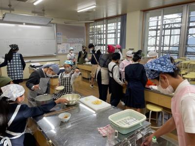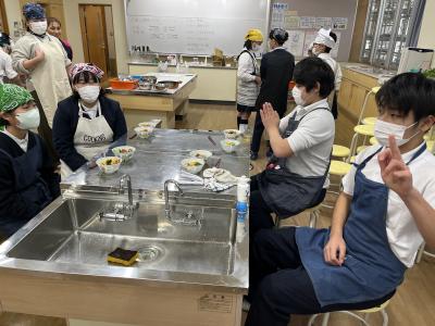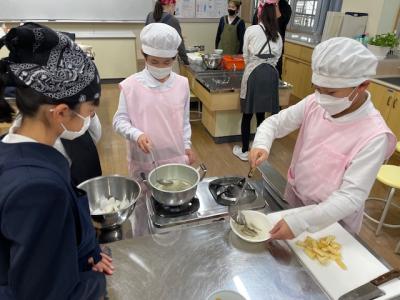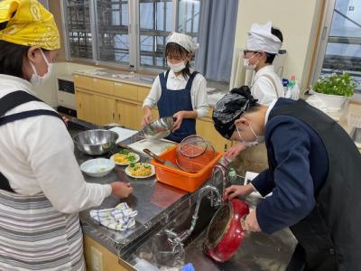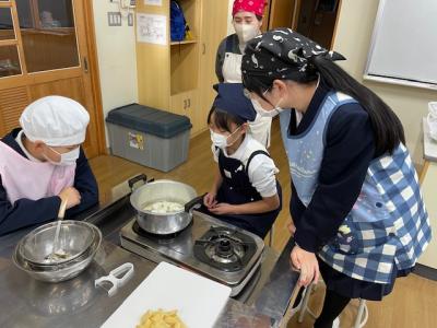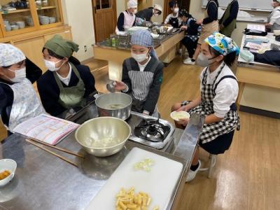 昨日は5年生がみそ汁を、本日は6年生が「おかず」を作りました。各グループで、野菜や卵、加工食品などを使ってゆでたり炒めたりして作りました。味付けも、自分たちの好みでしたようですが・・