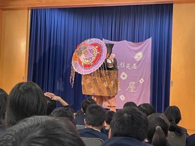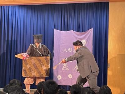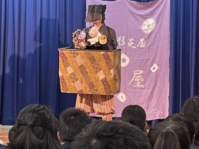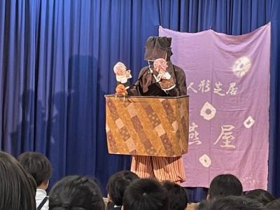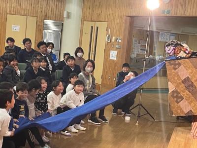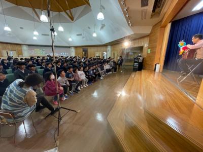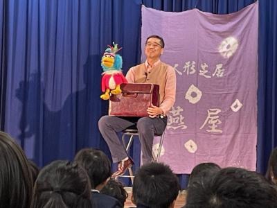 長野県の松本市から、「ひとり人形芝居」される、くすのき燕さんが来校し、腹話術と人形芝居を見せてくださいました。腹話術では、カンクローとのやり取りに、園児を含めた子どもたちは大笑い。