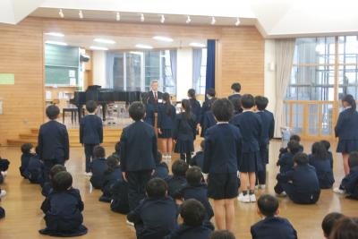 冬休みの生活について、気を付けて欲しいことを新谷教諭からお話がありました。「ふ・ゆ・や・す・み」の頭文字から5つのポイントを話されました。「み」みんな元気に始業式で!