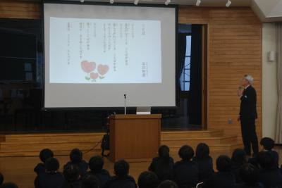 校長先生の話では、2つの詩を例に「ことば」について考えてみようと呼びかけられました。1つ目の詩では、自分に対して言われる(相手に対して言う)言葉はには、明日が見える言葉と見えない言葉あること。