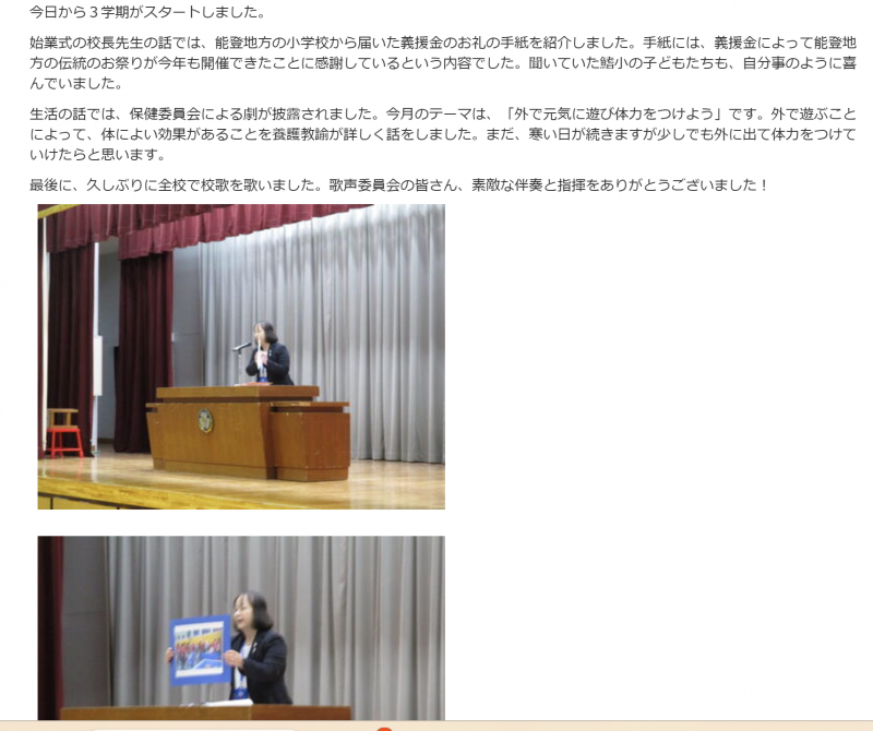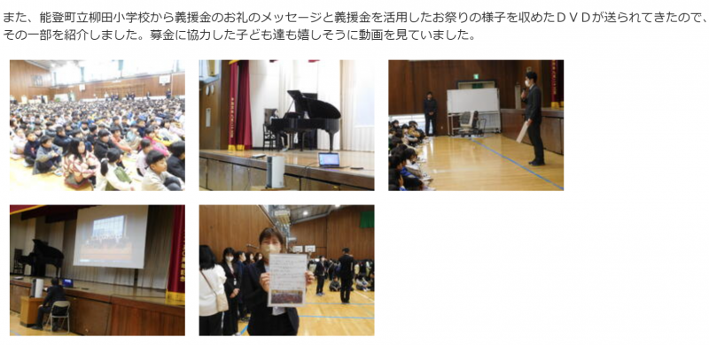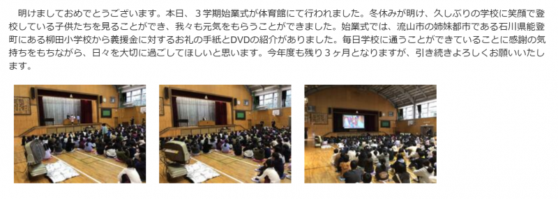 6年生は昨年末に流山市内の小学校へ、義援金のおかげで「柳田小笑顔まつりwith町野小」ができたことに感謝して、お礼の手紙と笑顔まつりの様子を映したDVDを送りました。そこで、流山の小学校では、始業式や学校だよりで紹介してくだいさいました。