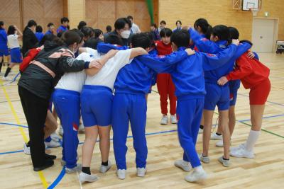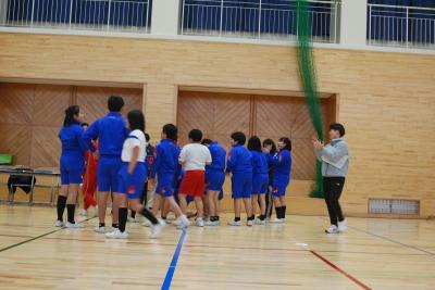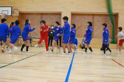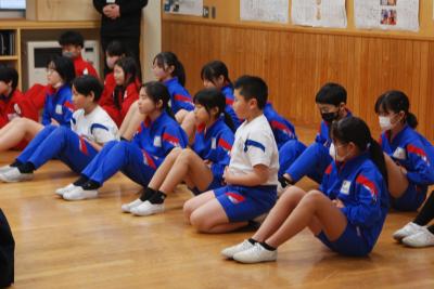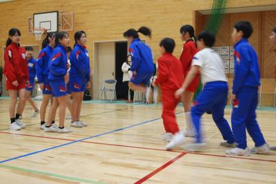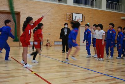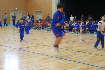 次は、学年ごとの「連続8の字跳び」は3分間にどれだけ跳べるかを競います。各学年の目標(最高記録)に挑戦です。高学年になれば気持ちを1つにするために円陣を組んで始めていました。