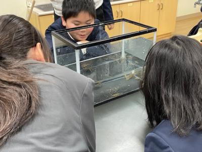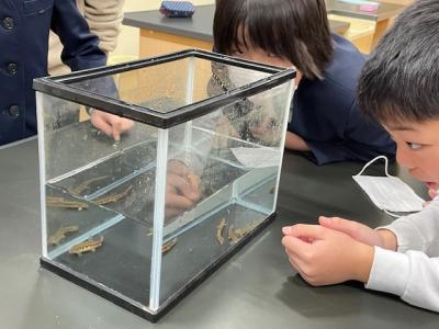 いよいよ町野川に住んでいる生き物が登場すると、児童の目つきが変わります。イワガメや手長エビ、オイカワ、ドジョウなど本物をしっかり観察しました。