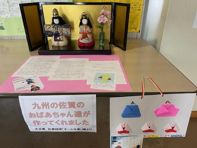 以前にも支援物資をいただいた、任意団体チーム生駒代表の塩田照夫さんから、佐賀県のおばあちゃん達が作った「ひな人形」が届きました。おばあちゃん達は、柳田小・町野小の子ども達の幸せを願って、折り紙で作ってくださいました。