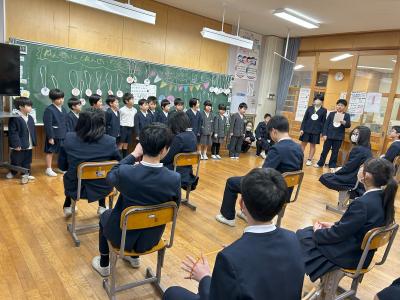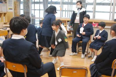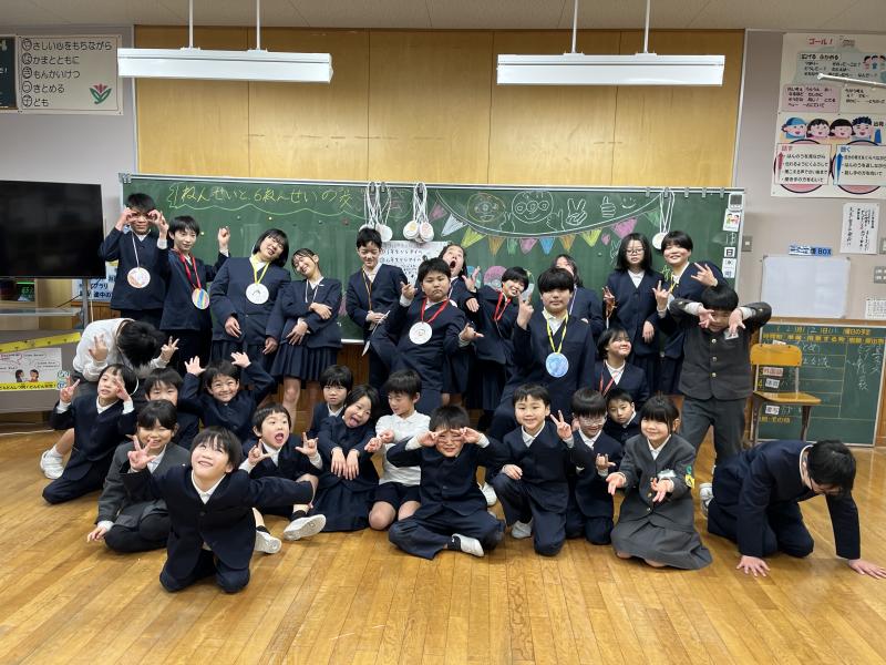 2025年2月13日 08時40分1年生が6年生にメダルをプレゼントしました。これまで、いろいろお世話してもらった感謝の気持ちとともに贈りました。その後、6年生と一緒に、「フルーツバスケット」「絵しりとり」や「だるまさんがころんだ」などで交流しました。