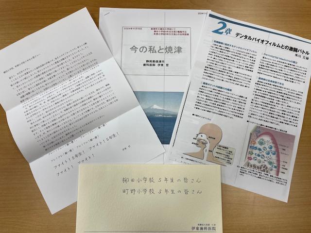 2024年12月16日 01時20分11月15日(金)に5年生を対象に、静岡県焼津市から災害ボランティアとして能登を何度も訪れている、歯科医師の伊東先生からお手紙と授業の資料が届きました。お手紙には、5年生と授業をして初めて体験したことや、感想文をもらってとても感激したことがつづられていました。また、最後には能登や5年生に向けて励ましのエールもいただきました。