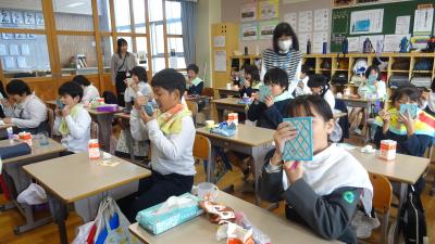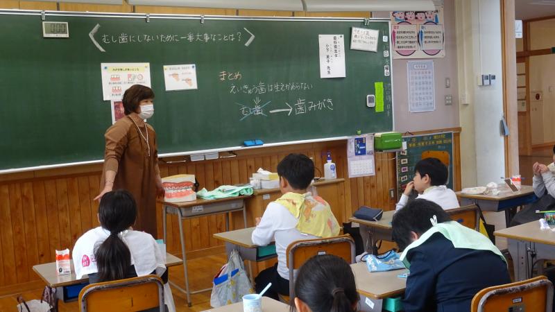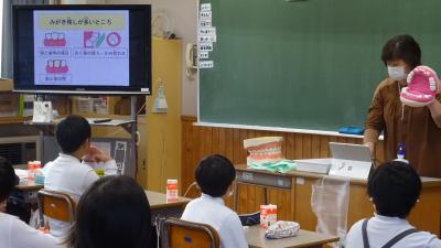 今年も歯科衛生士の小下美子先生に、4年生の歯みがき指導をしていただきました。毎日しっかり磨いているつもりでも、磨きの残しがあるもです。自分の歯のみがき方のくせをしっかりわかって、ていねいにやさしく磨きたいですね。