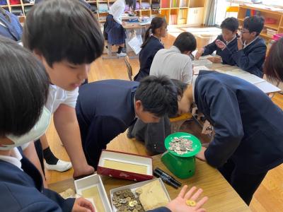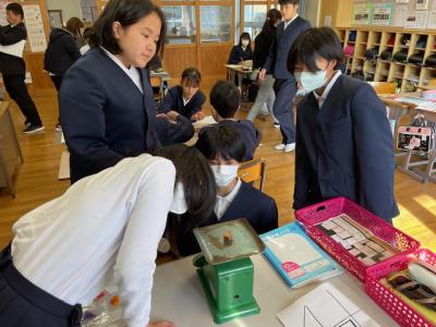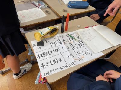 6年生が算数で学習した比例の考えを使って熱海市立伊豆山小学校からいただいた義援金の総額を予想しました。どの硬貨も10枚の重さを量って、全部の重さを量り、何枚あるかを予想しました。
