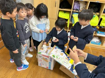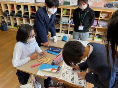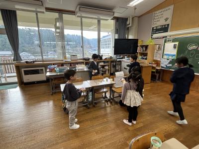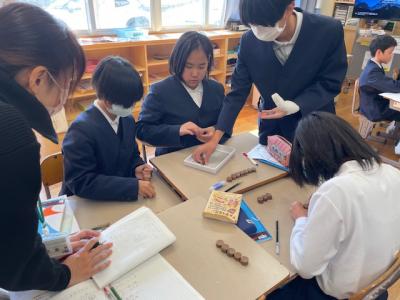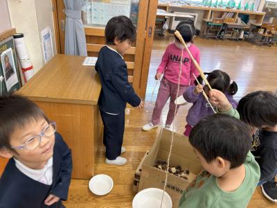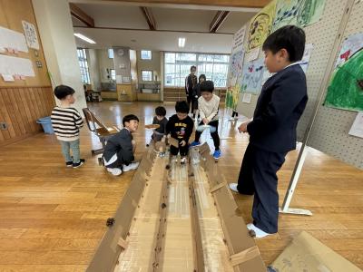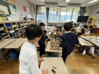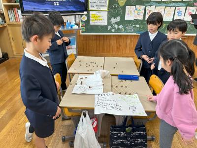 21日(木)の2限目に、保育所の園児を迎えて「秋のおもちゃランド」を開催しました。1・2年生が、秋の木の実や葉っぱなどを使った、様々なおもちゃを楽しんでもらいました。
